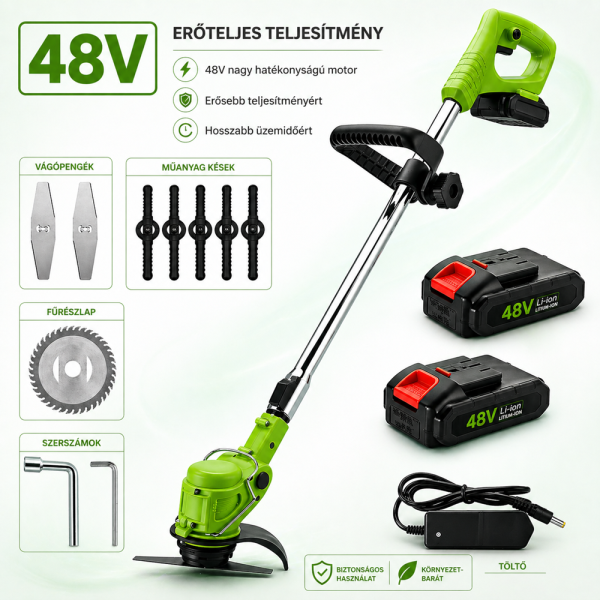 A KIYOSHI 48V akkumulátoros szegélynyíró és fűkasza egy sokoldalú és könnyen használható kerti eszköz, amely ideális választás a gyep szegélyeinek vágásához, a nehezen hozzáférhető helyek tisztításához és a kert rendezéséhez. A vezeték nélküli kialakításnak köszönhetően szabadon mozoghatsz a kertben, miközben az erős motor és a cserélhető vágóeszközök hatékony munkavégzést biztosítanak.